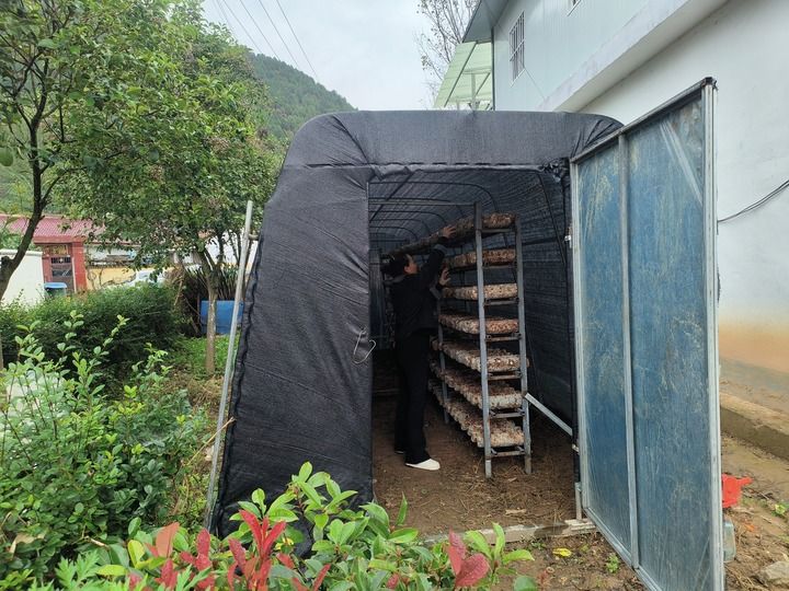 在两当县左家乡,一位村民在自家屋后的香菇棚中劳作。新华社记者 王紫轩 摄