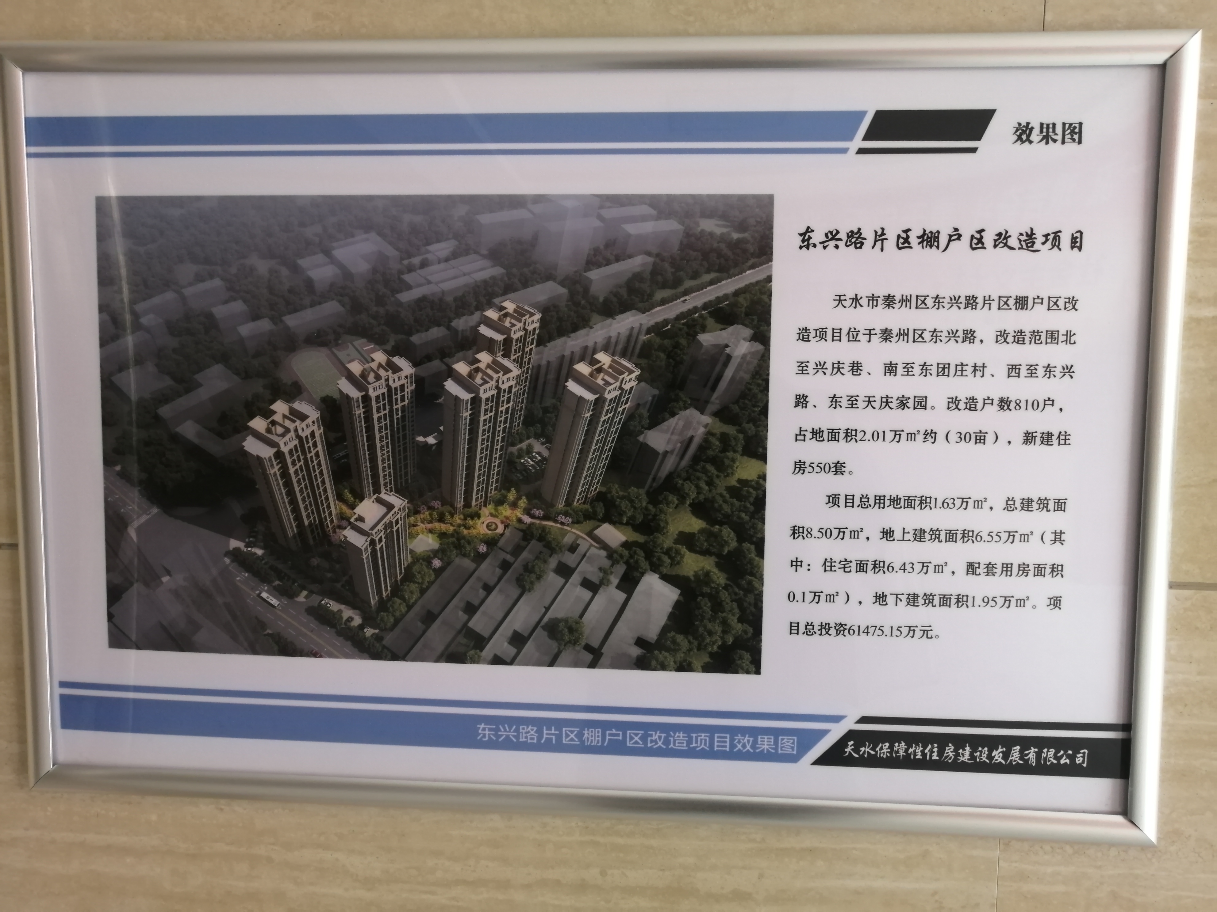 您在《帮您问》栏目的留言已收悉,记者就东兴路棚改项目一事向城市更新、住建等相关部门进行了咨询,最后得知具体实施该项目棚改工作的是天水保障性住房建设发展有限公司,于是记者来到该公司进行采访,得知,东兴路片区棚改项目的改造范围北至兴庆巷,南至东团庄村,西至东兴路,东至天庆家园。改造户数810户,占地面积2.01万平方米(约30亩),新建住房550套。项目总用地面积1.63万平方米,总建筑面积8.50万平方米,地上建筑面积6.55万平方米(其中住宅面积6.43万平方米、配套用房面积0.1万平方米),地下建筑面积1.95万平方米。