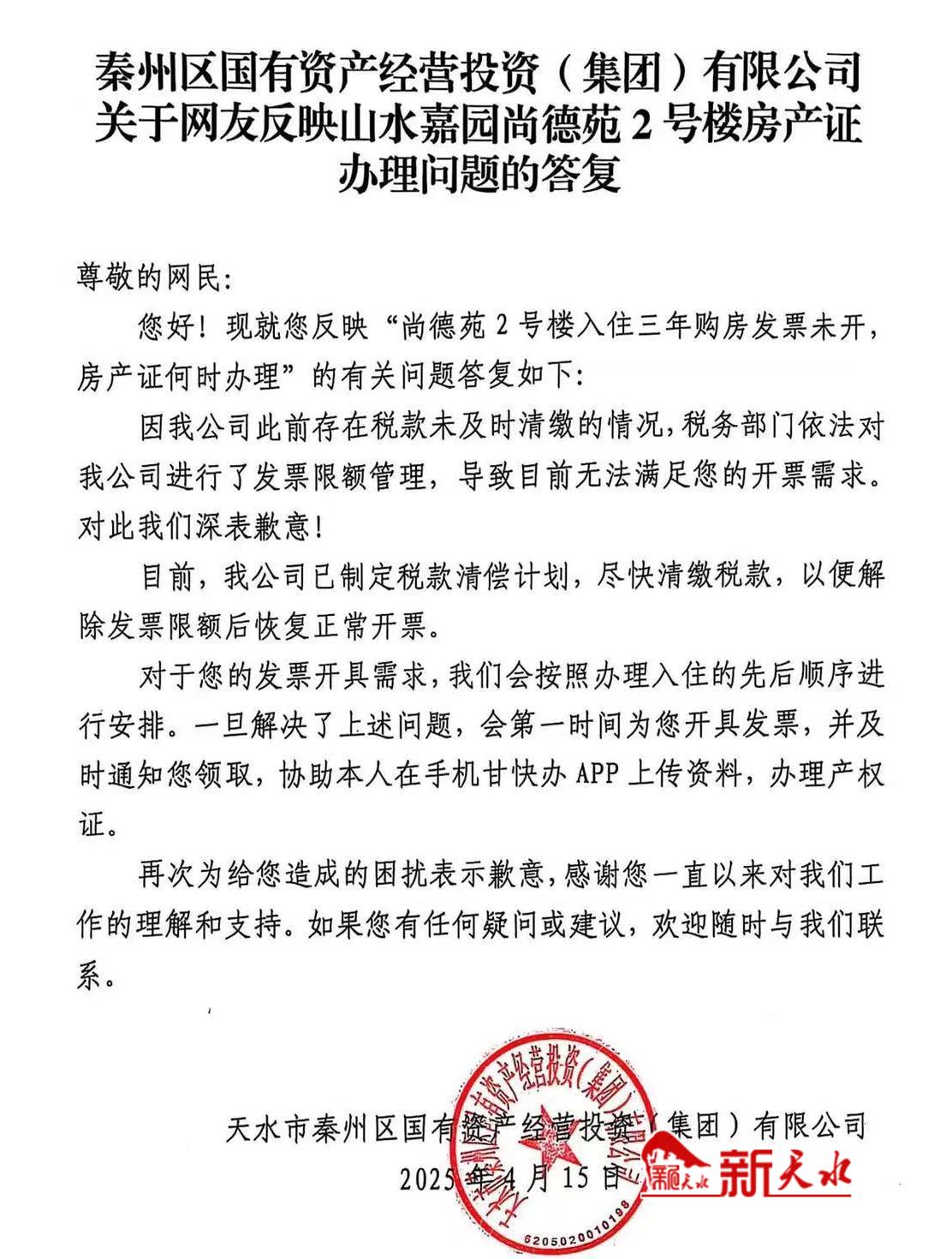 尊敬的白先生,您好!收到您的留言后,栏目记者第一时间联系了天水市秦州区国有资产经营投资(集团)有限公司,几经问询核实,工作人员向《帮您问》栏目记者作出了以下答复: