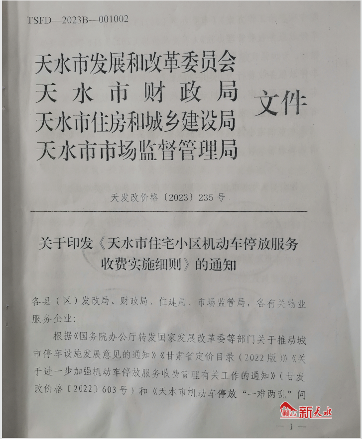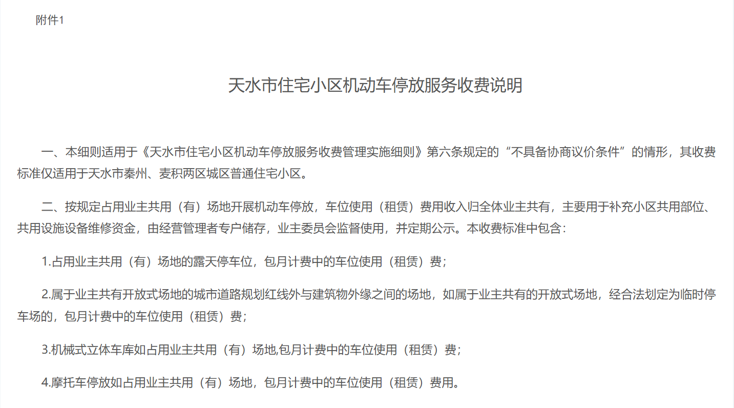 为加强我市住宅小区机动车停放服务收费管理,规范机动车停放服务收费行为,运用价格杠杆合理调控停车需求,提高停车资源配置效率,维护机动车停放者和机动车停放服务经营管理者的合法利益,2023年8月23日,天水市发展和改革委员会、市财政局、市住房和城乡建设局、市市场监督管理局联合发布了《关于印发<天水市住宅小区机动车停放服务 收费实施细则>的通知》(天发改价格〔2023〕235号),通知中公布了市发改委会同相关部门在成本调查的基础上,依据国家和省、市等相关法律法规及政策规定制定的《天水市住宅小区机动车停放服务收费实施细则》。