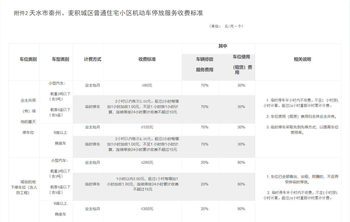 附件2 天水市秦州、麦积城区普通住宅小区机动车停放服务收费标准