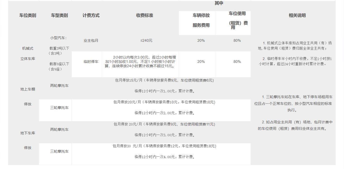 二、按规定占用业主共用(有)场地开展机动车停放,车位使用(租赁)费用收入归全体业主共有,主要用于补充小区共用部位、共用设施设备维修资金,由经营管理者专户储存,业主委员会监督使用,并定期公示。本收费标准中包含: