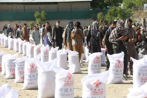 ▲ 2022年4月23日,阿富汗民众在喀布尔领取中国援助的粮食。