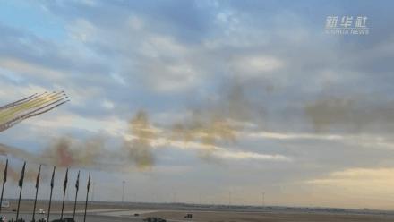 ▲ 2022年12月7日,中国领导人专机抵达沙特阿拉伯首都利雅得,受到沙方热烈欢迎,礼宾护卫机在空中拉出象征中国国旗的红黄两色彩带。