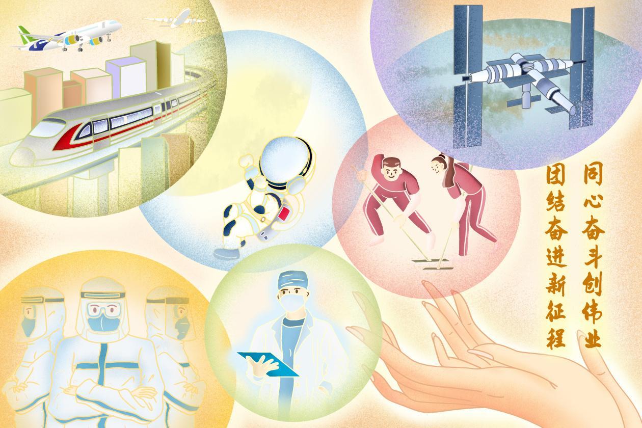 “五个一百”是奋进中国的“水彩画”。时不我待,惟有奋进。冬奥赛场上,体育健儿奋勇拼搏,不断刷新着新的记录和奇迹;太空探索方面,嫦娥五号携带采集的月壤顺利返回地球,神舟十四号、十五号航天员乘组首次实现“太空会师”;科技创造领域,我们的新能源汽车研究制造走在世界前列,航母接续下水……人民群众对美好生活的向往,就是党和人民的奋斗目标。在发展新征程,整个中国都在全力以赴,各行各业创新创业、改革拼搏的缩影,是一幅色彩斑斓的水彩画。