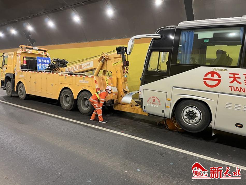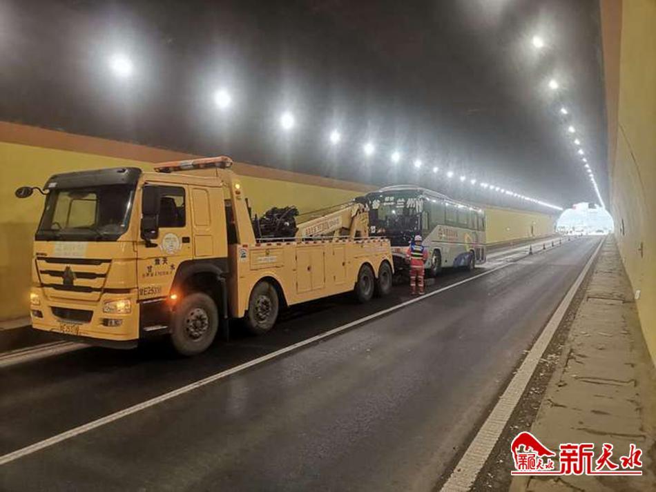 新天水讯【通讯员文邦宇】1月13日,一辆客车因突发故障被困高速公路隧道内。所幸在高速公路天水清障救援一大队的救援下,故障车辆被及时拖出隧道,车上的20多名乘客也被安全转运。
