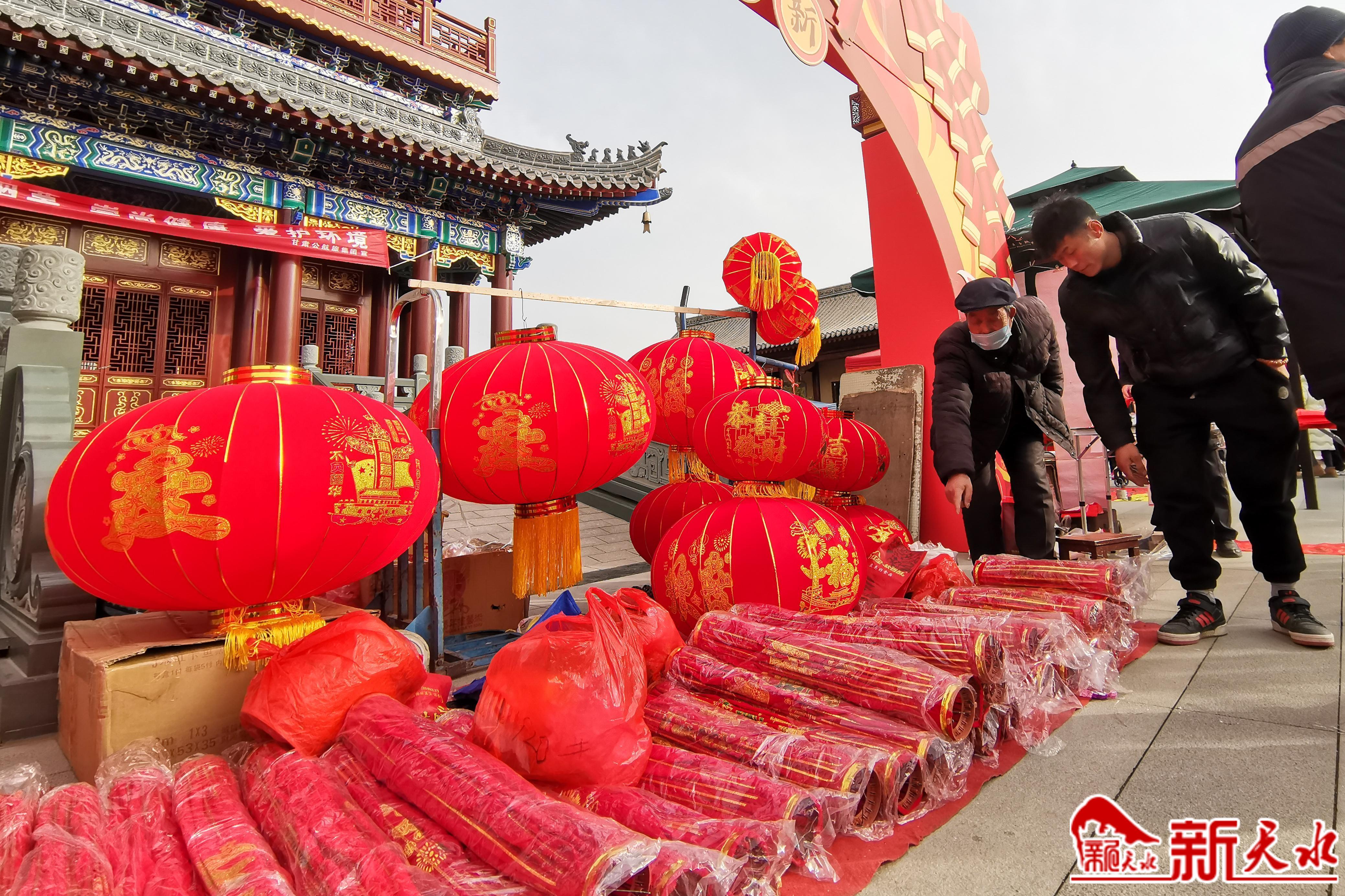 1月17日,天水古城启汉楼广场的年货市场一派喜庆红火的景象。春节临近,市民们在这里选购大红灯笼、春联、福字,装扮家居,喜迎新春佳节。 新天水记者 孙镇 摄
