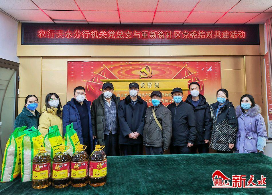 中城街道重新街社区联合辖区共建单位区融媒体中心、农行天水分行、中城派出所、建行天水分行等开展了春节慰问活动。活动中,慰问人员为辖区困难居民送去了米、面、油等生活用品,将党和政府的关怀送到群众心坎里。