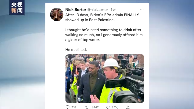 美国独立记者尼克·索托16日发文称,事发13天后,环保署署长里根才出现在东巴勒斯坦城,他向里根提供了一杯当地的自来水解渴,但这位署长拒绝了。