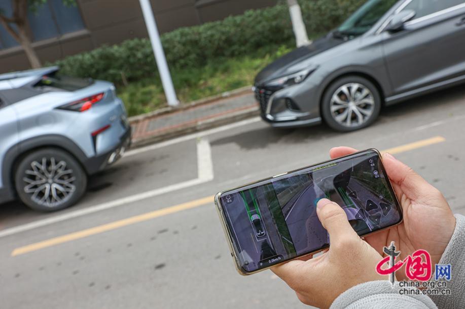 一名工作人员演示APA6.0远程智能泊车技术。它能打破用户和车辆距离限制,用户通过手机,就能远程智能泊车和挪车,还能全方位感知探测行人或者障碍物,侦测到周围障碍物时,主动停止泊车操作。中国网记者 伦晓璇 摄