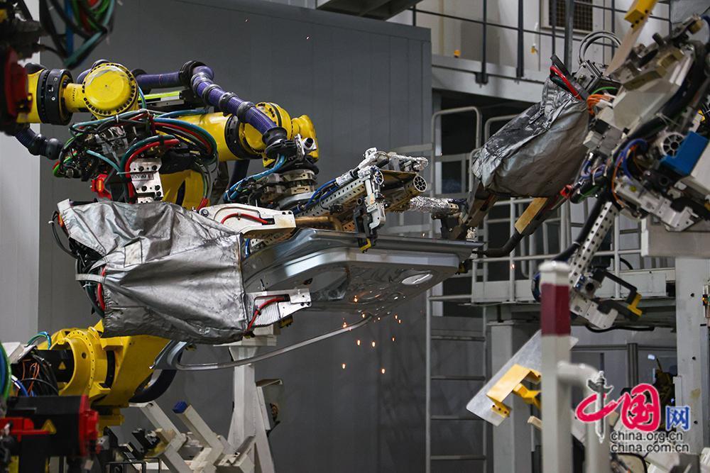 2月18日,赛力斯汽车两江智慧工厂焊接车间。得益于先进的激光远程飞行焊技术,不接触零件便可实现快速焊接。中国网记者 伦晓璇 摄