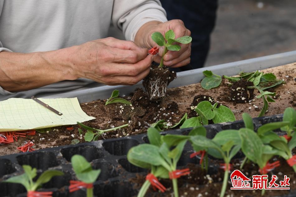 2月17日上午,在武山县山丹镇周庄村育苗基地的大棚内,一排排育苗盘整齐摆放,一株株幼苗长势良好、青翠欲滴。技术人员韦健全将南瓜苗和黑籽西瓜苗嫁接在一起,动作细致,手法娴熟。“黑籽西瓜味道好但根系较弱,而南瓜苗根系发达、抗病性强,将这两个品种接到一起就能增强品质、提高产量。”韦健全说。