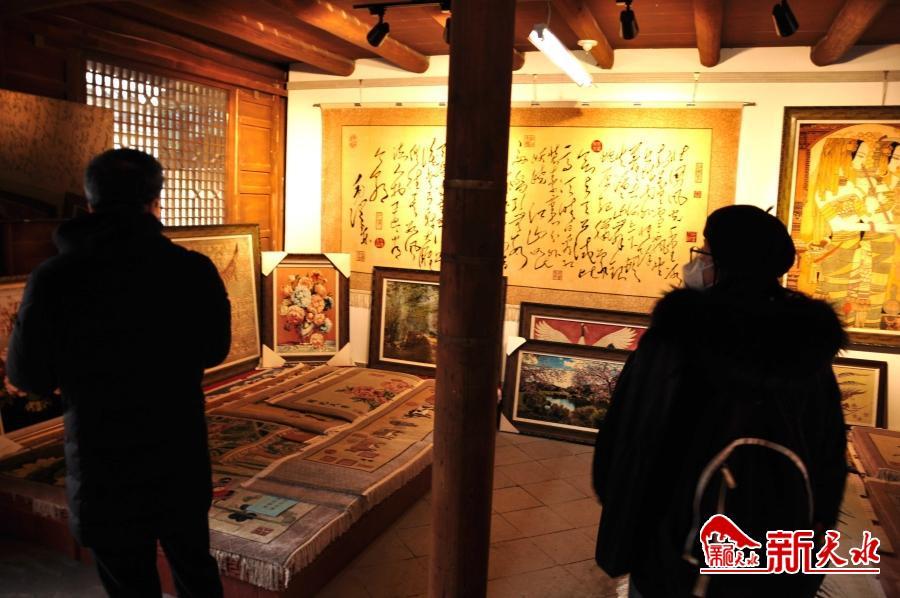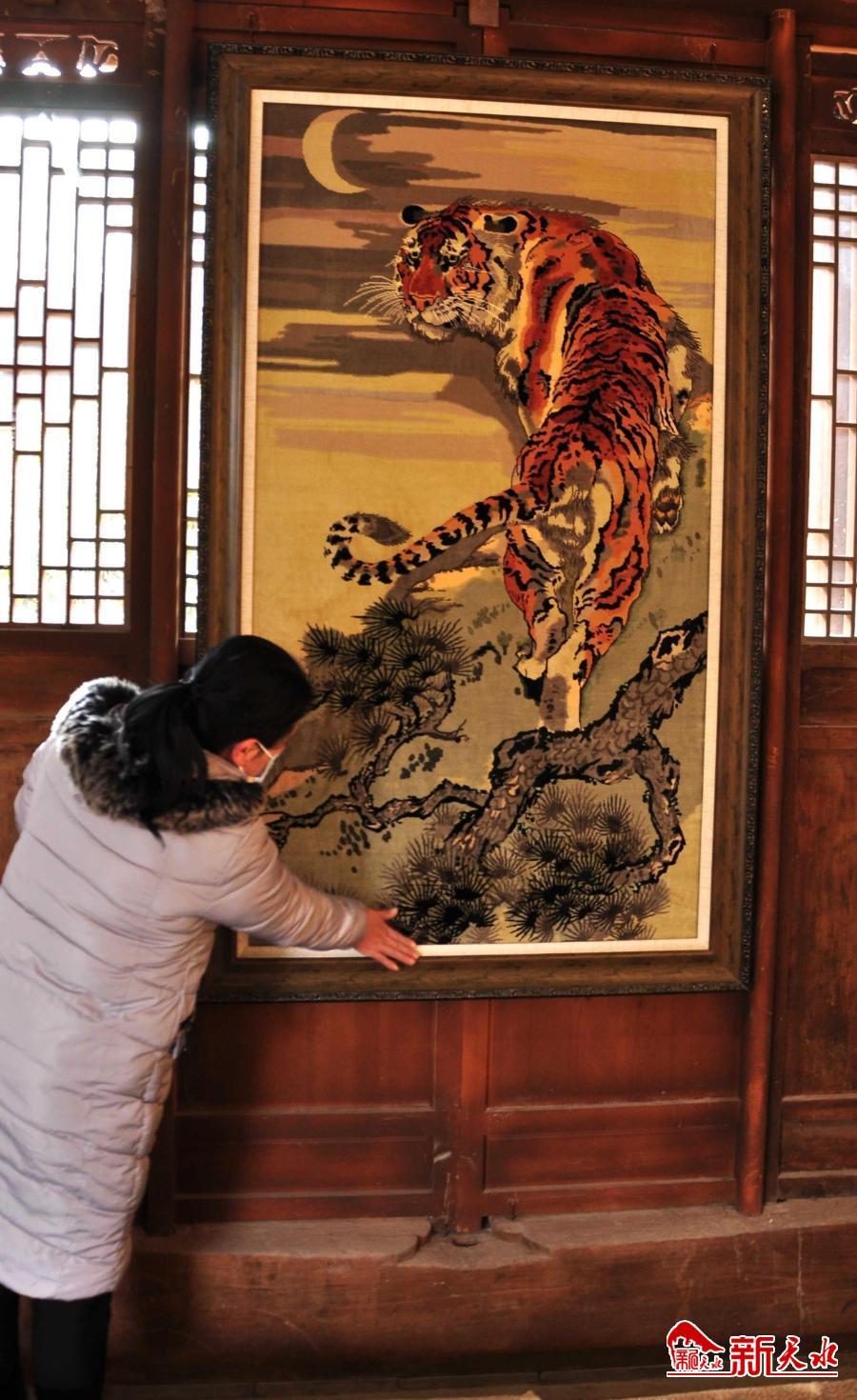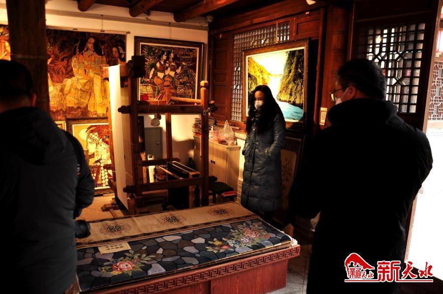 2月16日,在位于天水西关古城华严街38号的国家级非物质文化遗产天水丝毯文化技艺博物馆的展示陈列馆内,游客在精美的丝毯展品前流连忘返。在紧挨着展示陈列馆后面的织造车间,工人们正在忙碌着织造丝毯。