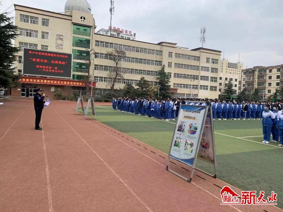 新天水讯【记者张彬霞】2月22日下午,在天水市第五中学,秦州区东关街道盛源社区联合秦州公安分局东关派出所开展禁毒宣传进校园活动。