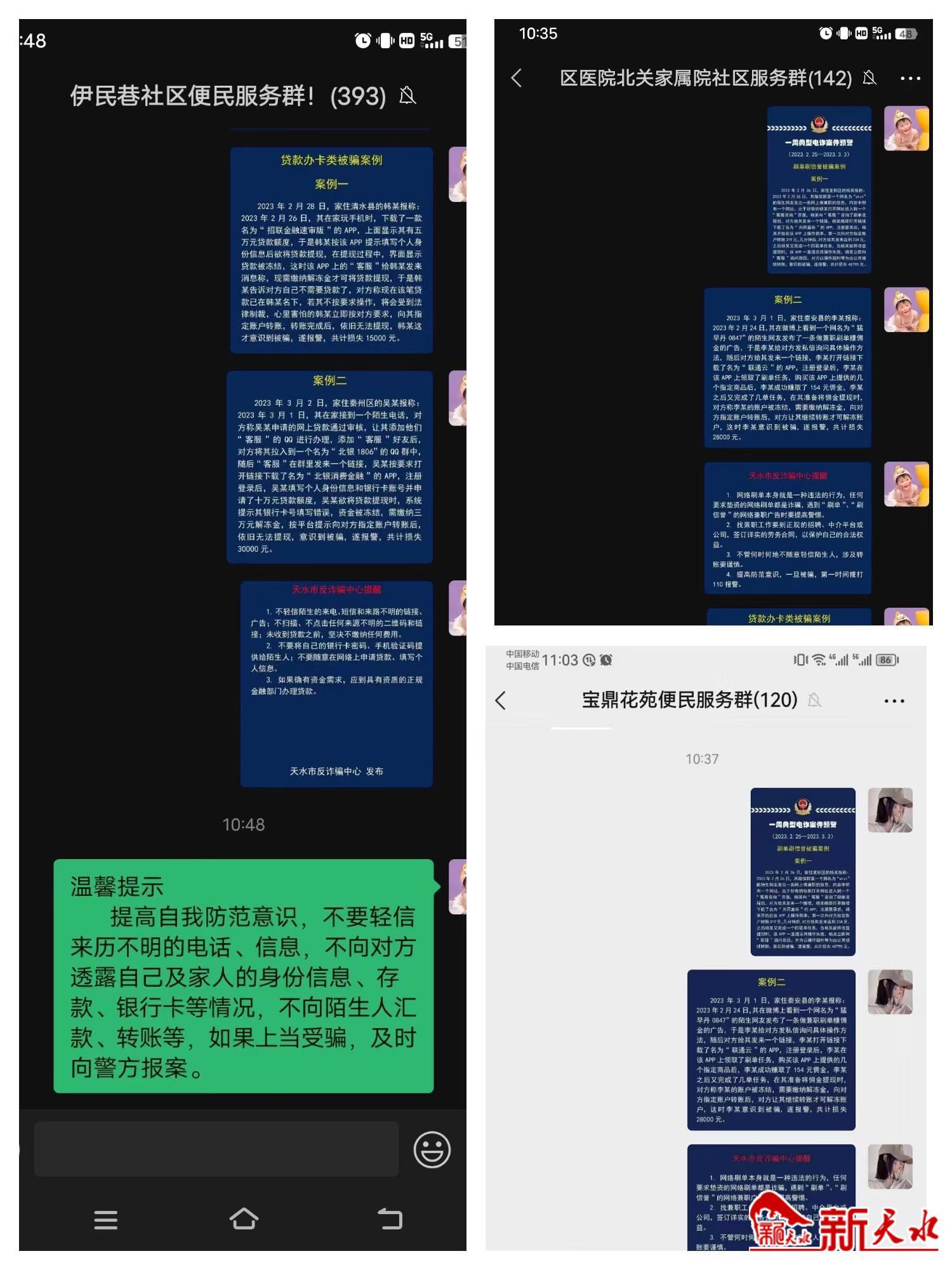 新天水讯【记者马海林】为进一步提高辖区居民对电信网络诈骗的自我防范意识,营造“人人识诈、全民防骗”的浓厚氛围,3月3日,秦州区中城街道伊民巷社区开展线上反诈宣传活动。