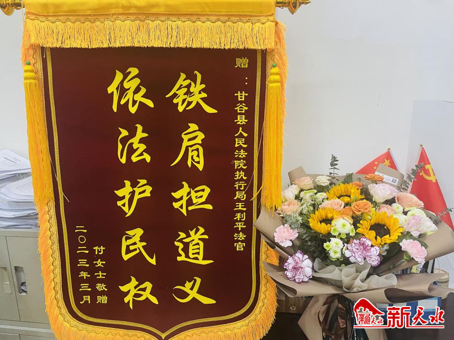 新天水讯【记者蔚军平】近日,付女士将一面写有“铁肩担道义、依法护民权”的锦旗赠送给了甘谷县人民法院执行局的法官,感谢法官对一起终本案件及时启动恢复执行程序,圆满执结了涉及自己的一起民间借贷纠纷执行案件。