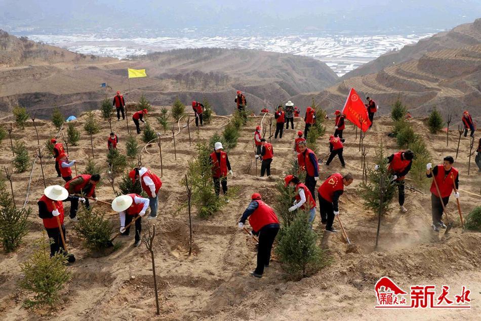 在5天的时间内,武山县3000多名干部职工在盘龙山2000亩义务植树基地参加义务植树活动,栽植下36000多株云杉、红叶李等树种,让荒山化作满坡金。同时,各乡镇组织干部职工在本乡镇开展义务植树,“红马甲”播种下“绿色希望”。