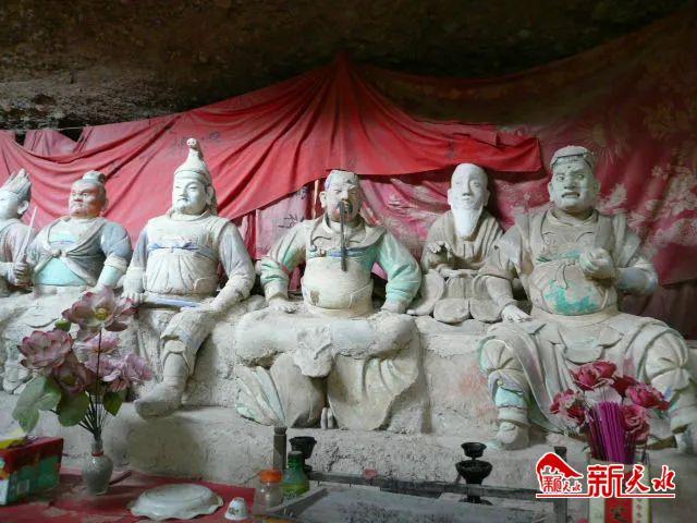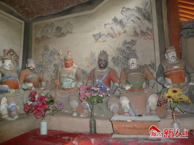 水帘洞石窟群始建于十六国时期的后秦,原有菩萨殿、老君阁、四圣宫等殿阁。经北魏、北周、隋、唐五代至元,历代屡有修建。虽经重修却已失其原貌。殿外石壁现存北魏壁画约30平方米,绘千佛。北1公里,有千佛洞,原有7窟,现残存壁画绘千佛、说法图、飞天、供养人及牛车,具北周风格,画面着色瑰丽,残存造像,圆润丰满,神态各异。以拉稍寺、千佛洞的摩崖题记、雕塑作品、壁画及木构遮檐最为珍贵。