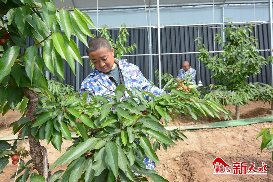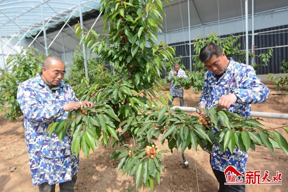 人勤地生金。穿梭在樱桃棚里,一棵棵栽植整齐的樱桃树枝叶繁茂,长势喜人,一簇簇色泽红艳的樱桃缀在绿叶间。“预计还有半月时间,樱桃就能上市。”县世亮说,今年第一年坐果,产量估计有5000余斤。