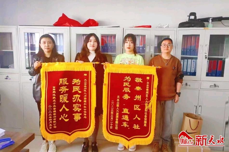 新天水讯【通讯员 赵雅琪】4月21日,天水众萃人力资源公司员工来到秦州区人社为民服务“直通车”咨询服务窗口,送上两面锦旗,感谢秦州人社为民服务“直通车”解决了他们的急难愁盼问题。