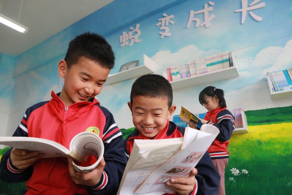 4月20日,山东省高密市崇实小学的学生在校园图书角阅读图书。新华社发(李海涛 摄)