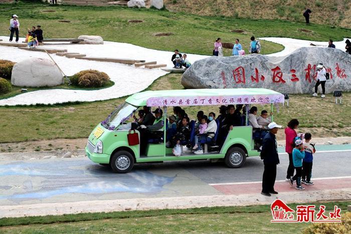 假日期间,记者在清水县花舞北山景区入口处看到,众多游客有序排队乘坐观光车入园,一派热闹景象。