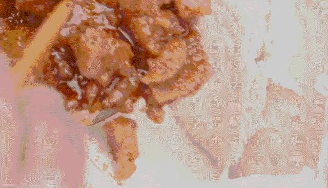 搅拌:一锅呱呱大概要30斤荞麦淀粉,一个小时的时间里,需要不停地搅拌,这一动作是制作呱呱的关键。随着浓度的增加,搅拌的速度也随之加快。这一环节也是最费工夫的,必须要搅拌均匀、稀稠得当,而且还要时刻掌握好火候。呱呱淀粉经过长时间的热力作用后,由入锅时的白色变成了粉色,色泽往往决定着呱呱出锅的时间,直至搅拌到锅内形成厚厚一层色泽黄亮色之际便可出锅了。出锅后装入盆内加盖,经过回醒,一锅香气四溢的天水呱呱就完成了。
