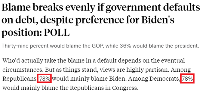 美国《华盛顿邮报》和美国广播公司联合进行的民调显示,在发生债务上限危机时,来自共和党的受访者指责拜登的可能性与来自民主党的受访者指责国会共和党人的可能性一样大,都达到了78%。这也从另一个侧面印证了美国党派之争僵持不下。