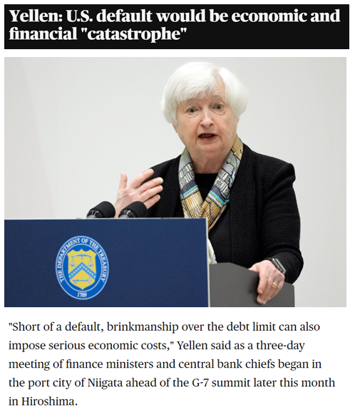 5月11日,在日本新泻举行的七国集团财长会期间,美国财长耶伦再度就美国债务即将突破上限问题“发声”,她说美国若出现债务违约将“害人又害己”,同时呼吁美国国会再次提高债务上限。