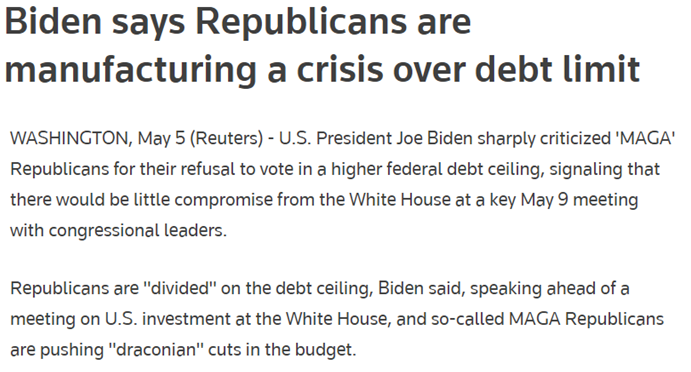 拜登还指出,债务违约是一场人为制造的危机。美国应该以负责任的方式削减开支,降低赤字,避免不必要的危机。
