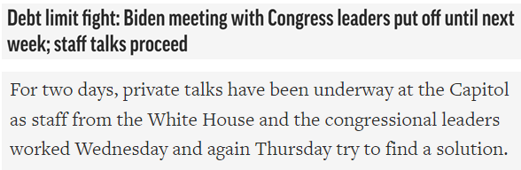 此前被寄予厚望的、原定于12日举行的美国总统拜登与国会高层讨论债务上限问题的会议也被推迟。据白宫发言人透露,双方同意在下周举行会议。