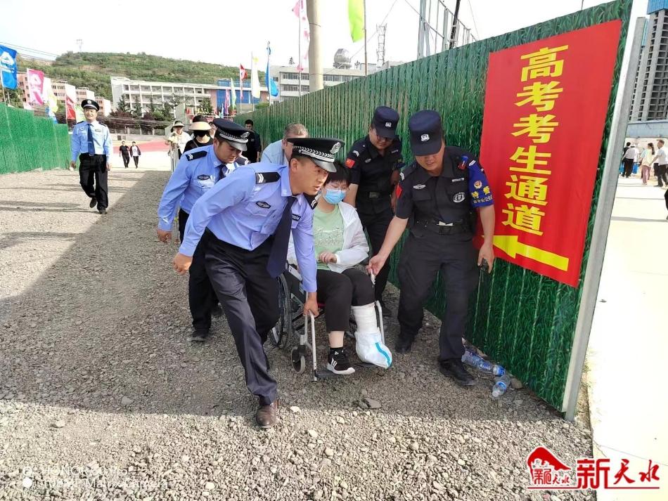 新天水讯【记者张彬霞】6月7日8时许,秦安县公安局民警在秦安县第一中学考点执勤时,发现人群中有一考生父亲推着坐在轮椅上的女孩走出了考点,在砂石路面上该考生父亲用力艰难地推着轮椅,尽管用尽了力气,但轮椅还是挪动缓慢。见状,考点执勤民辅警立即上前帮助该考生父亲合力将其推出砂石路面。