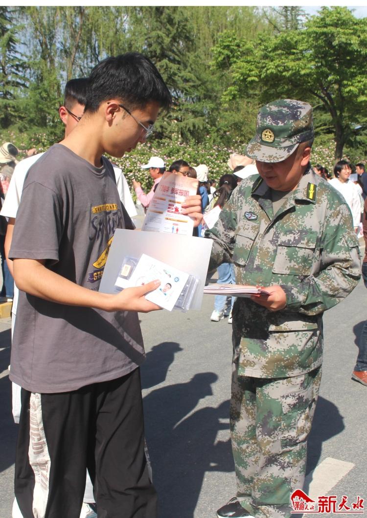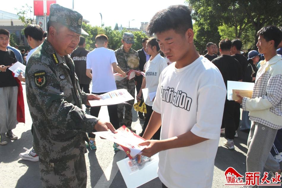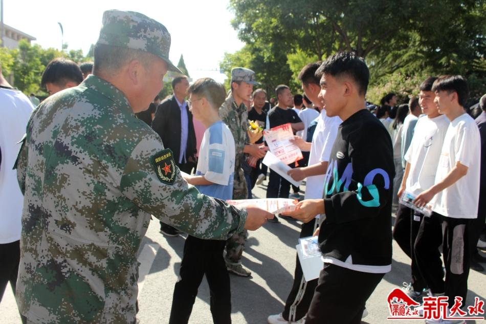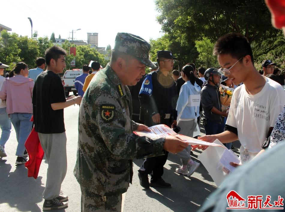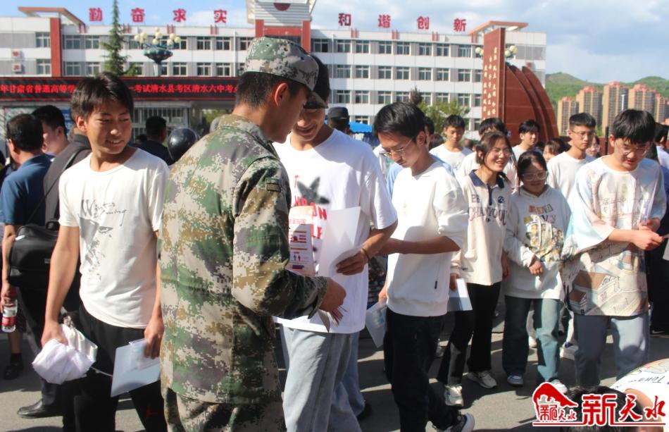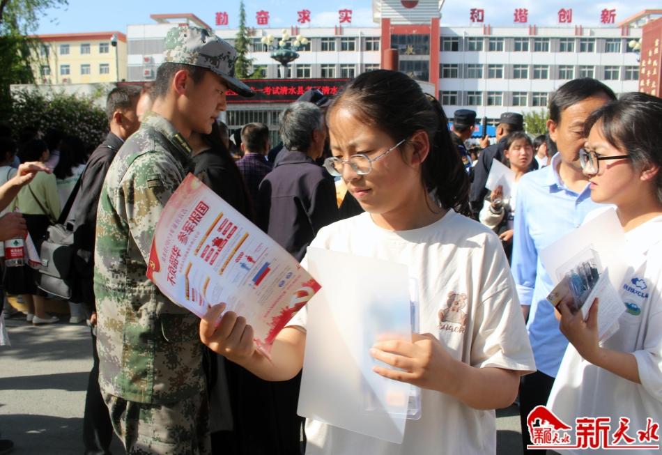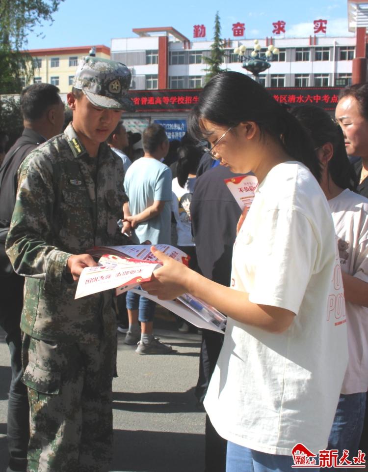 为营造浓厚的征兵宣传氛围,有效激发广大青年学生参军报国热情,6月8日,清水县人武部在县域部分考点附近设立征兵咨询点,摆放征兵政策宣传展板,向广大家长和走出考点的青年学生发放征兵宣传单,详细介绍入伍流程、应征条件和优抚优待优惠政策等,充分调动适龄青年到部队成长成才和家长支持子女从军报国的积极性。广大家长们纷纷表示,希望孩子能穿上军装,到军营建功立业,为建设国防奉献青春智慧和力量。新天水记者王莹 摄