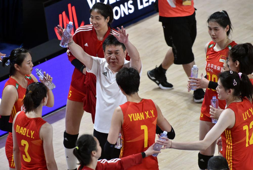 6月13日,2023世界女排联赛中国香港站在香港体育馆举行,图为中国队主教练蔡斌(中)指导球员。新华社记者 卢炳辉 摄