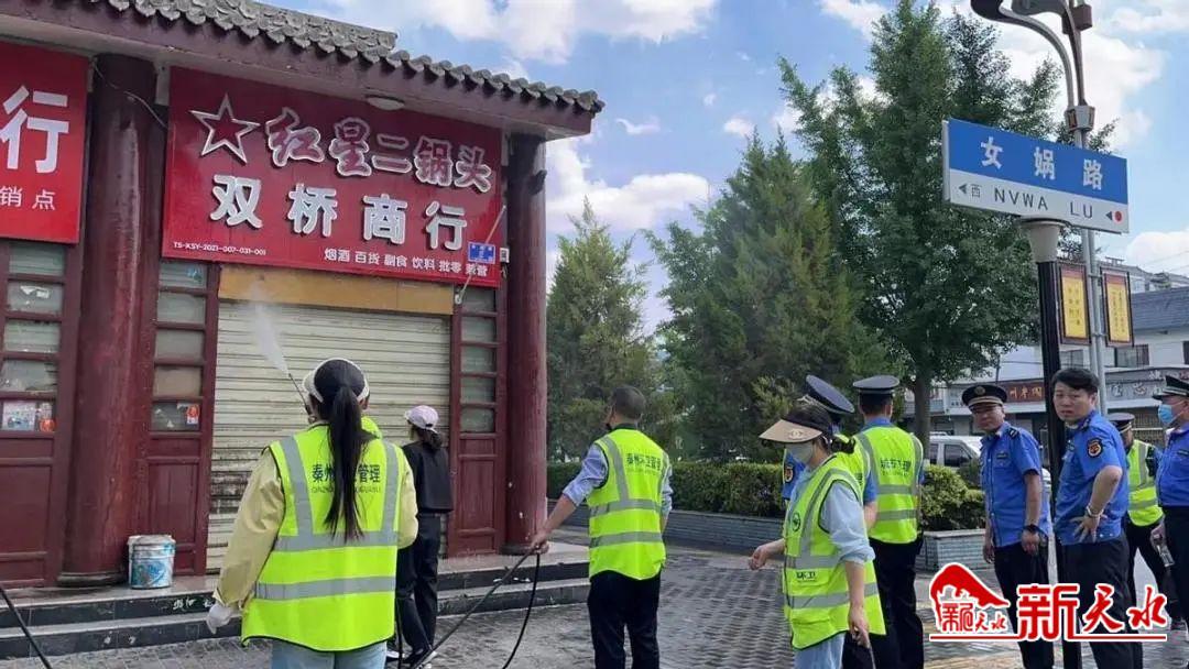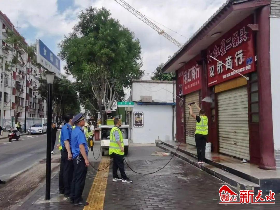 整治行动中,执法人员严格按照“全面治理、长效监管”的原则,对辖区主次干道、背街小巷及伏羲庙周边的店外经营、占道经营、乱立广告牌、乱吊乱挂、乱停乱放等影响市容市貌的行为进行全面治理;中队还联合环卫部门对双桥路所有门店门头、卷闸门、门窗等进行集中冲洗,并督促各家商户对门店外形象进行整改,对破损门头、广告牌及时进行拆卸。