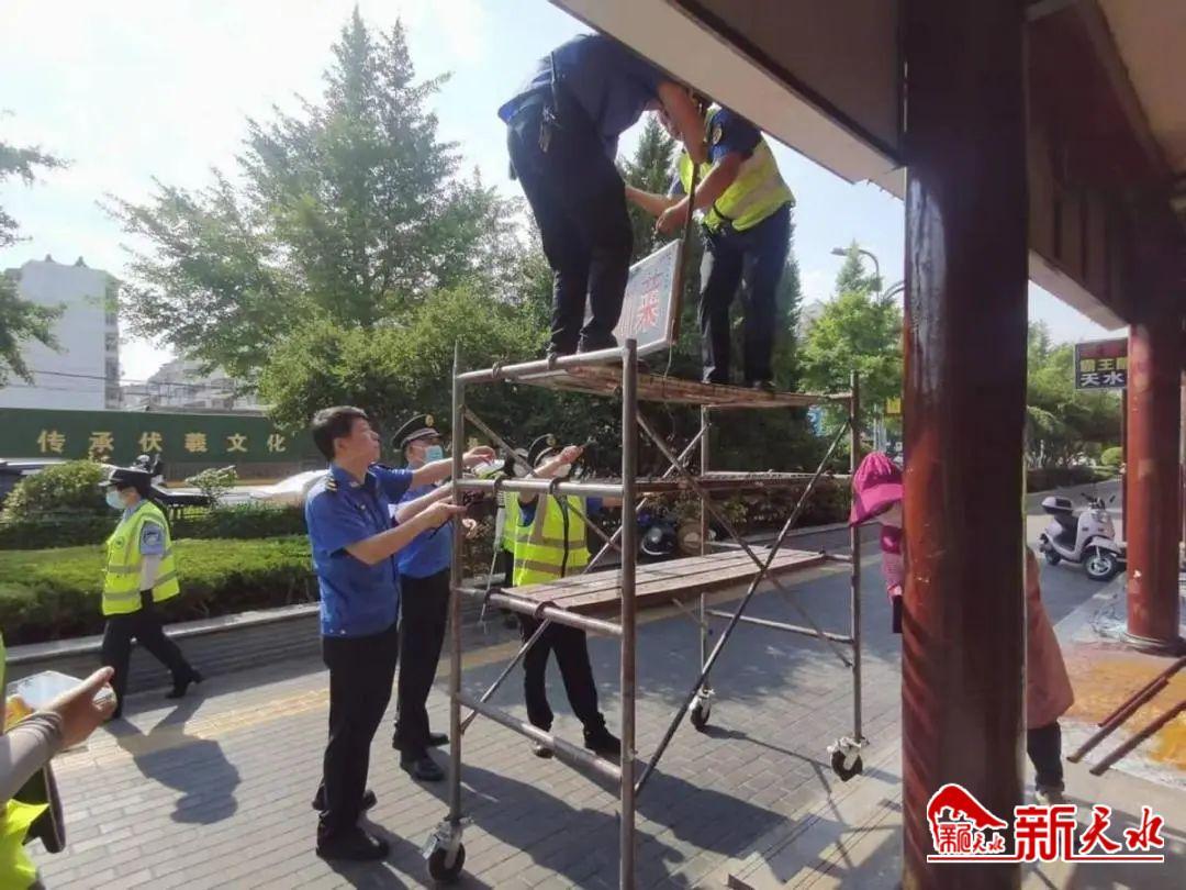 新天水讯【记者王晓华】6月15日早上,在秦州区女娲路,执法人员正在对附近不规范的门店门头进行清理。