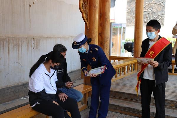 消防员在景区内向游客发放消防知识宣传册。临夏州消防救援支队供图