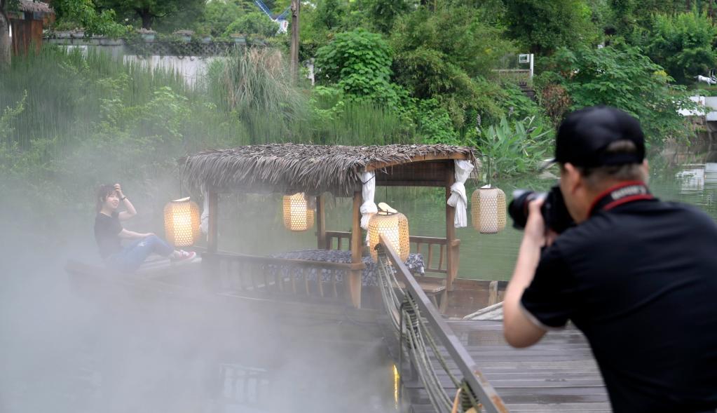 6月5日,在湖州市安吉县灵峰街道横山坞村的小瘾半日村,游客在民宿内拍照留念。新华社记者才扬 摄