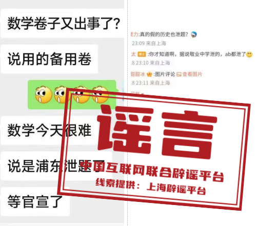 真相:上海市教育考试院回应,网传泄题说法为不实信息,称“目前各科考试已全部结束,情况正常,不存在泄题的情况。对于制造谣言者,将保留追究其法律责任的权利,请大家不信谣、不传谣”。相关传言源自参加中考的未成年人,当事人承认其发布的内容并无证据,只是臆测。相关部门已对其父母进行了教育。(来源:上海网络辟谣)
