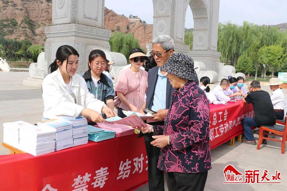 新天水讯 6月20日,甘谷县总工会在大像山公园举行网络安全、禁毒、安全生产、结对关爱、职工互助保障等主题宣传活动。