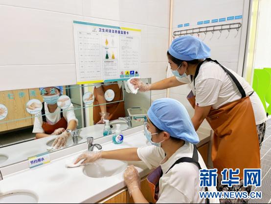 济南市槐荫区济水上苑幼教集团御峰幼儿园保育员正在擦拭盥洗室。新华网发(姜晓楠 摄)