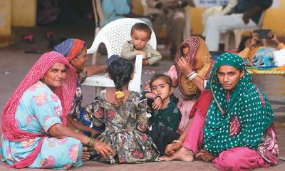 6月17日,在印度古吉拉特邦杰考,人们坐在临时居所内。飓风“比帕乔伊”过境,印度西部超过10万名民众受到影响。