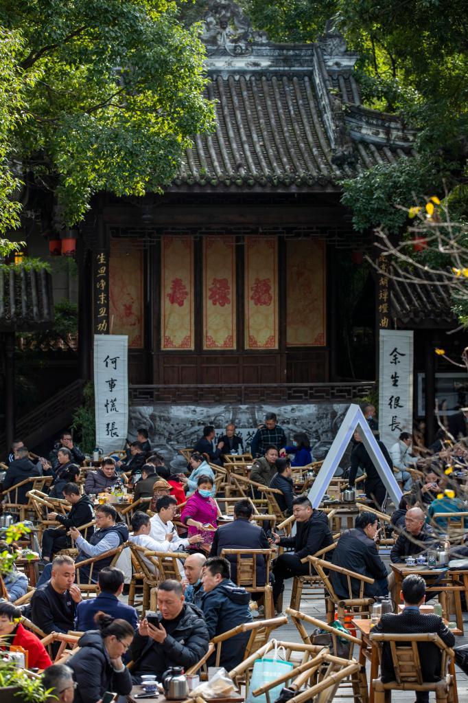 图为成都铁像寺水街的陈锦茶铺前,人们正在喝茶休闲。新华社记者 沈伯韩 摄