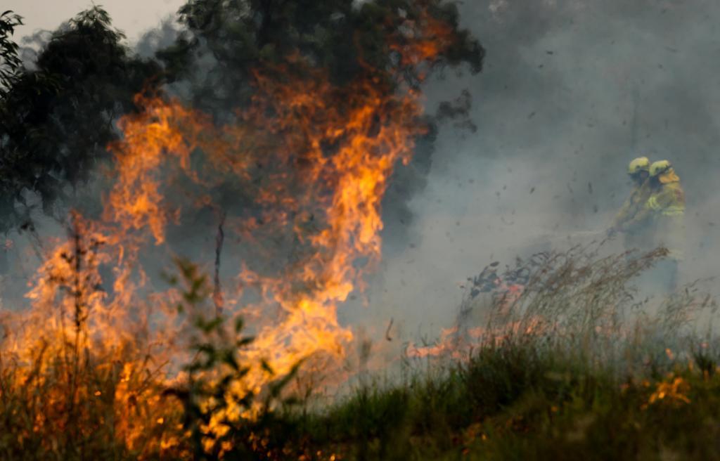 2019年11月11日,在澳大利亚新南威尔士州塔里附近的山地,消防员在扑灭山火。新华社记者 白雪飞 摄