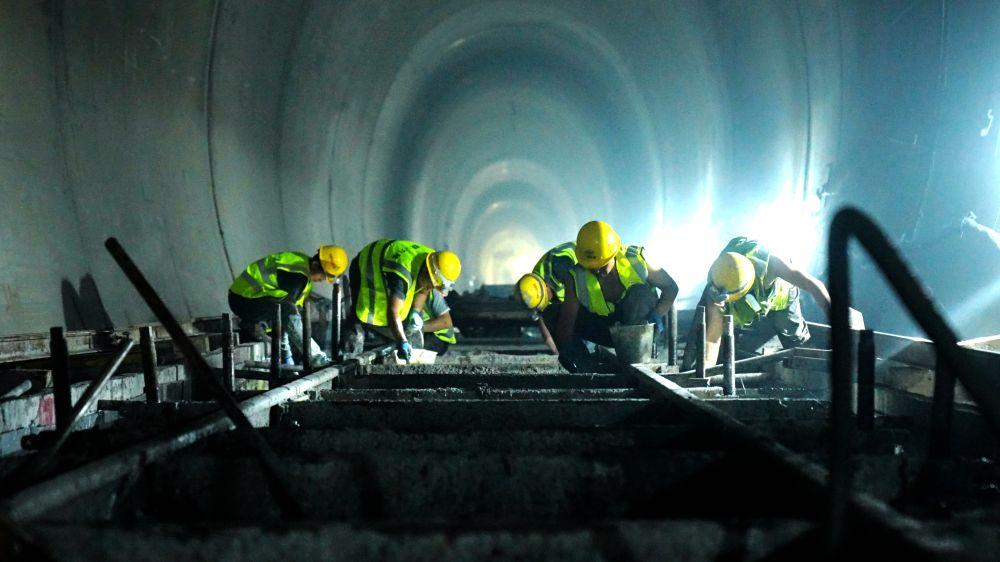 7月8日,滇藏铁路丽香段哈巴雪山隧道内,建设者进行无砟道床施工。(新华社记者 丁怡全 摄)