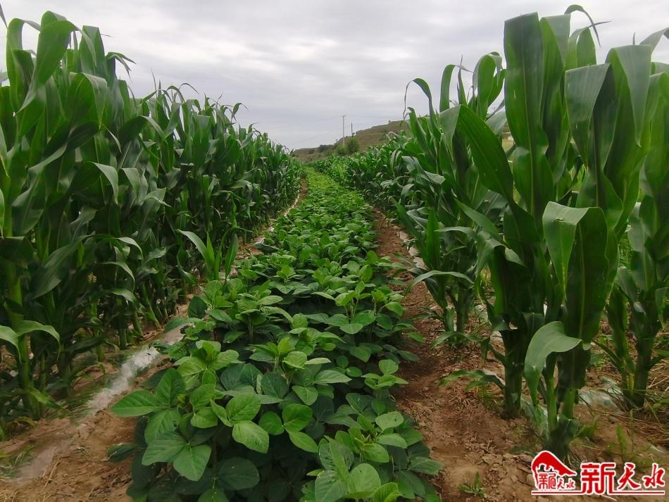 盛夏时节,在清水县郭川镇黄大村玉米大豆带状复合种植田里,成片成片的玉米、大豆竞相生长,玉米叶子宽大,大豆枝叶繁茂,一派勃勃生机。