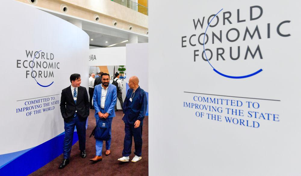 第十四届夏季达沃斯论坛与会者在论坛设置的新领军者村内交流(6月27日摄)。新华社记者 孙凡越 摄