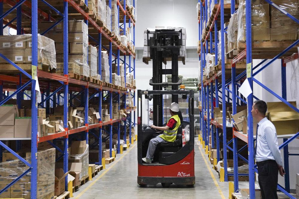 在上海虹桥商务区保税物流中心(B型),工作人员在运输跨境电商货物(5月13日摄)。新华社记者 马宁 摄