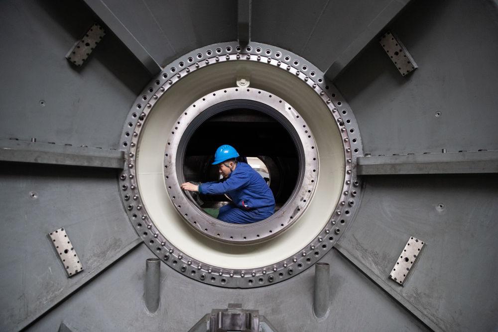 工人在哈电集团哈尔滨汽轮机厂有限责任公司车间内生产作业(4月28日摄)。新华社记者 张涛 摄