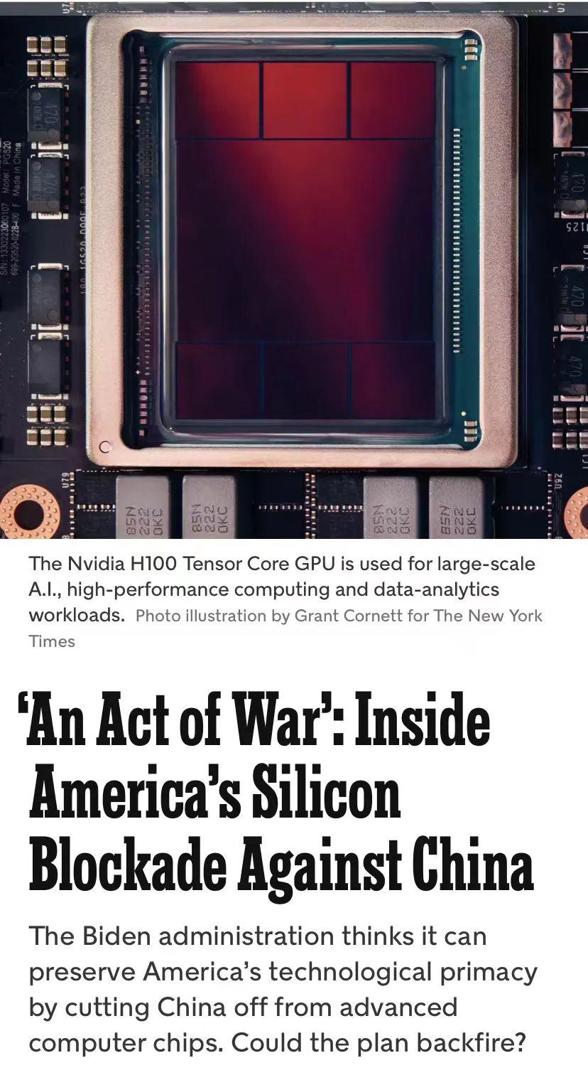 此前,《纽约时报》的一篇深度报道披露了不少芯片管制的重大信息,如美国操纵芯片管制的根本意图、对华芯片封锁行动时间线、美政客将台湾作为“棋子”的战略考量等,报道称美国对中国的芯片封锁无异于一场战争,并认为美国对华芯片管制很可能刺激中国芯片业长期增长,芯片管制只是在拖延时间。